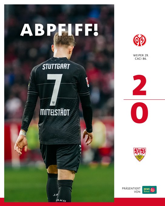 Schlusspfiff! Gebrauchter Nachmittag in Mainz. Der #VfB unterliegt dem FSV Mainz 05 mit 0:2. Bereits in der ersten Halbzeit hatte Nelson #Weiper die Hausherren in Führung gebracht. Anthony #Caci erhöhte kurz vor Schluss noch. Kopf hoch, Männer! [Anzeige] REWE #VfB | #Bundesliga