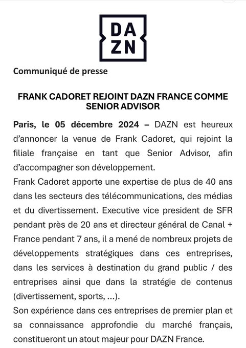 DAZN continue de recruter chez les anciens cadres de Canal+. Après Brice Daumin, comme DG France, Frank Cadoret devient « Senior Advisor » de la plateforme 👇🏼