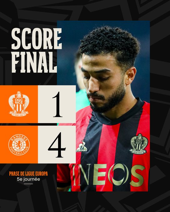 Buts : Bouanani (83e) pour Nice ; Cerny (35e), Mohammed Diomande (38e), Igamane (45e+3, 54e) pour les Rangers.